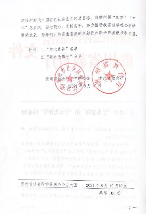 近日,经过贵州省社会科学界联合会、贵州省教育厅联合评审和推选,球盟会思想政治教育专业的2位硕士生导师王纪鹏教授和沈洋副教授被命名为贵州省社会科学2021年度“学术先锋”,球盟会则被命名为贵州省社会科学第三批“学术先锋号”,这是继2019年和2020年公司已有3位老师和1个单位获评贵州省“学术先锋”和“学术先锋号”后,再次获此殊荣,这些成绩反映出球盟会在社会科学人才培养、团队队伍建设及马克思主义理论团队建设等方面取得了新突破,将为公司社会科学发展再添内生动力。
