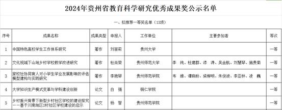 2024年8月5日,贵州省教育厅对2024年贵州省教育科学研究成果奖评审结果进行了公示。此次评奖是为了深入学习贯彻习近平总书记在中央政治局第五次集体学习时的重要讲话精神,贯彻落实2024年全国教育工作会议精神,致力建设教育强国,总结2019年至2023年贵州省教育科研战线所取得的优秀研究成就,调动广大教育工作者从事教育科学研究的积极性和创造性,以高质量的科研成果,为贵州省教育高质量发展提供智力支撑。为此,贵州省教育科学规划领导小组成立评审学术委员会,组织领导评审工作。贵州省教育厅于2024年1月24日发布了2024年贵州省教育科学研究优秀成果评选奖励活动的通知。