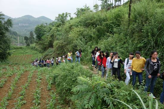 上午9点半师生们到达遵义县平正乡政府。首先,导游罗老师给大家简要介绍了平正仡佬族乡悠久的历史、红军长征经过平正期间发生的大事件及其著名的苟坝会议,长征中经过平正的红军领导人等。然后,罗老师带领同学们从平正乡政府驻地出发,先后经过了红一军团林彪、聂荣臻当时的指挥所,就是在这里林、聂发出建议攻打打鼓新场的十万火急电报。同学们在行军途中唱起了《映山红》,歌声飘荡在群山之间。沿途经过了红军长征时仡佬族头领山登铭迎接红军遗址,虽然时间已逝,听到导游的讲解,脑海中仿佛出现了他们迎接红军,军民热情欢呼、相拥的一幕幕。走了一段大路后,接着进入了一段曲曲折折的羊肠小道。据导游讲,这条小道不仅是当年红军经过的地方,而且也是古代的一条茶盐古道。走在这条泥泞的小道上,同学们深深的体会到当年红军行军的艰苦与他们的革命大无畏主义精神。最后到了一所当地老乡的房子,这所房子是当年红军行军途中驻扎休息过的地方,在房间的木板墙壁上还清晰的保留着当时红军的宣传标语。同学们伫立在这些标语前,默默的沉思,对红军们为了劳苦大众谋幸福的精神所再次感动。